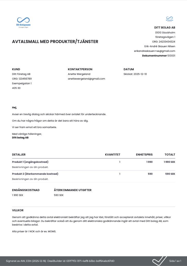 Exemplet nedan visar ett kontrakts- eller erbjudandeupplägg i DealBuilder, men dokumentet som signeras kan lika gärna vara en uppladdad PDF – till exempel ett avtal, ett erbjudande, ett arbetskontrakt, styrelseprotokoll eller årsredovisning. I DealBuilder kan du signera alla typer av dokument och själv välja vilken signeringsmetod som ska användas för varje dokument.