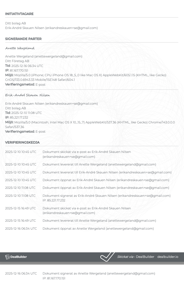 Under signeringsprocessen registreras flera datapunkter, till exempel avsändarens e‑postadress, tidpunkt för utskick, mottagarens e‑postadress, tidpunkt när dokumentet öppnas, mottagarens IP‑adress samt vilket system eller enhet mottagaren använder för att bekräfta avtalet, som webbläsare och version. Om signeringen görs med BankID verifieras även namnet och personnumret på den som signerar. All denna information sparas som en del av det signerade dokumentet och bidrar till att göra digitala kontrakt juridiskt bindande på samma sätt som en fysisk signatur.